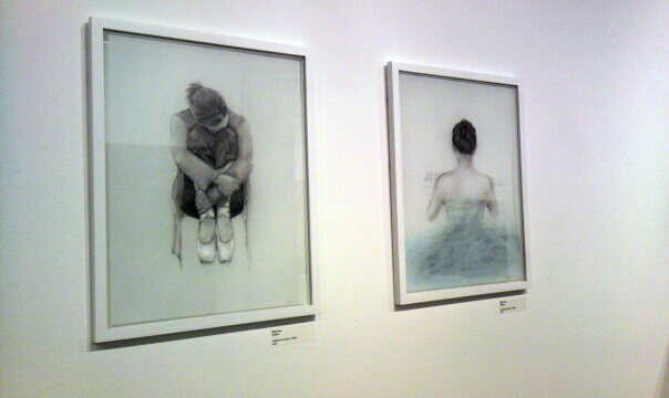 What I have been experimenting with lately is adding fluid acrylic paint to these drawings. Since Mylar is somewhat opaque, I learned that painting the backside of my drawing shows through quite nicely. It is great for adding tonal contrast/added highlights, while keeping my line work intact. For the ballerina drawing I decide to add white acrylic to her ballet shoes. As you can see, the highlight it produces draws your eye to her shoes. For the drawing on the right, light layers of blue paint were added on top of my drawing.