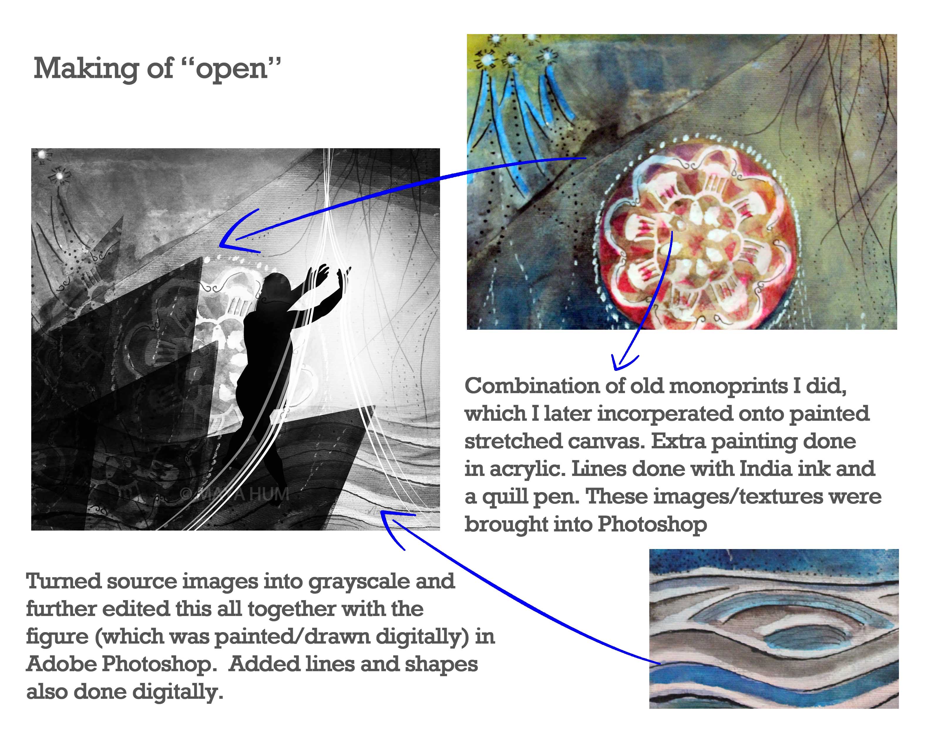 “Open” Posted on November 20, 2013 by mayahum Posted in Digital Art, IllustrationTagged Acrylic, art, Canvas, creative process, Digital Art, figure, India Ink, Open, Painting, Photoshop Decided to work on another digital art print, here is the finished piece titled: “Open” I feel very adventurous. There are so many doors to be opened, and I’m not afraid to look behind them. Elizabeth Taylor “Open” by Maya Hum 2013 The making of open: The Making of “Open” by Maya Hum 2013 Share this: Click to share on X (Opens in new window) X Click to share on Facebook (Opens in new window) Facebook Click to share on Pinterest (Opens in new window) Pinterest Click to share on Tumblr (Opens in new window) Tumblr Like Loading... Related