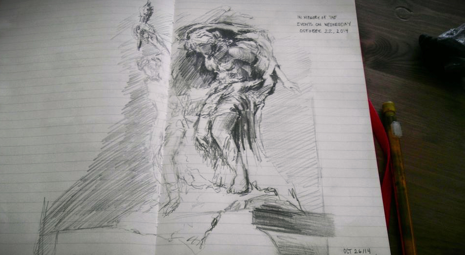 In memory of last Wednesday’s tragedy in Canada’s capital, a group of artists came together to draw this morning. This is a what I drew. A sketch of only a part of the Canadian War Memorial cenotaph. Art is healing.