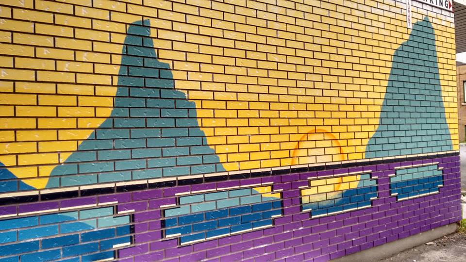 Originally I was asked to paint a different brick wall. One that is frequently vandalized. The idea was that a large cohesive painting would help prevent this. It would have been impressive in terms of scale and visibility. I was so excited to be asked and had put together a design pitch (see below), but… it was rejected by the property owner :(.