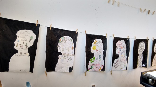 I taught a children’s art camp on portraits. This was my first art camp of the summer. We created a record number of works. Here is a look at some of them! Hover or click on an image to begin slideshow to show my captions.
