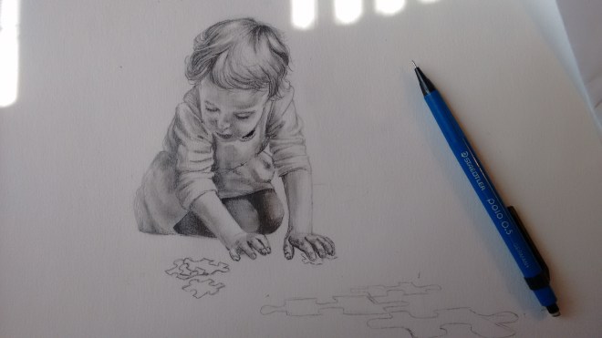 I started working a new one! The concept is that she is putting a puzzle together, and the puzzle she is sitting on is space. Here’s some quick photos I took as I worked on it:)