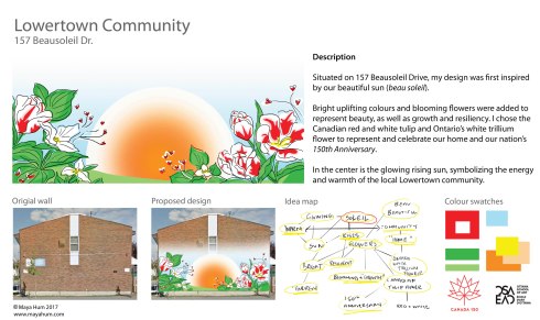 I considered its location (Beausoleil Drive – Beautiful Sun), symbols for the community and how to connect the mural to Canada’s 150th. Here is what my first idea map started to look like: