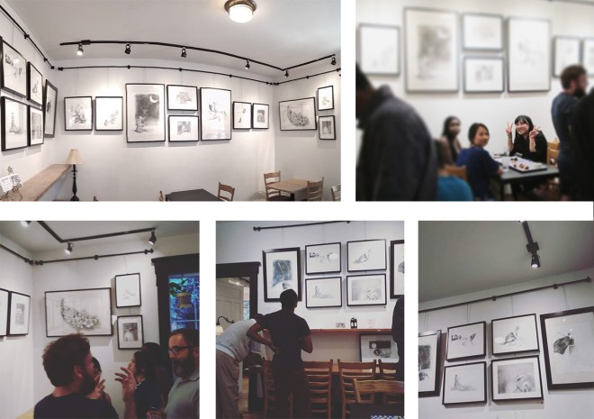 I hope to show a more robust version of this exhibit soon! But for now I am really happy with how my show looked at the Art House Cafe (the photos below are two lovely photos photographed by the gallery – click to enlarge). I got to talk to a lot of people during the opening night, friends, family and strangers. Your kind words have provided me with much encouragement to keep creating. I am so thankful.