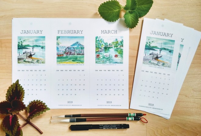 Keeping with tradition, I’ve designed and illustrated a free printable calendar for the new year! This year I decided to use some of travel paintings completed over the summer to illustrate your calendar. They are all scenes from around where I live in Ottawa and surrounding areas. I hope you enjoy them 🙂