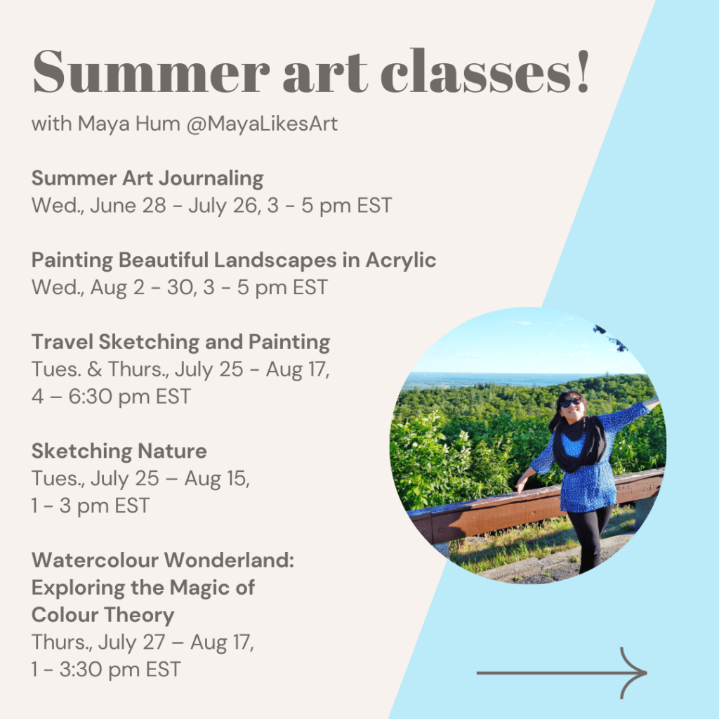 I’ve decided to offer a free online art journaling lesson to kick off the my summer season of teaching! Read below to learn more about what I am teaching over the next few months. Paid adult courses come with extra digital resources and include password protected recordings. Children’s camps are not recorded, but include an art kit (to be picked up in nearby a City of Ottawa centre). Maybe I’ll see you in my virtual classroom? π