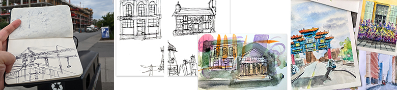 Learn the essentials of capturing the energy and essence of urban settings. Whether you’re a beginner or seasoned artist, this course will sharpen your skills in observation, composition, perspective and rapid sketching! We will use pencils, ink pen, and watercolours in this course. Registered students have access to password protected recordings of each lesson.